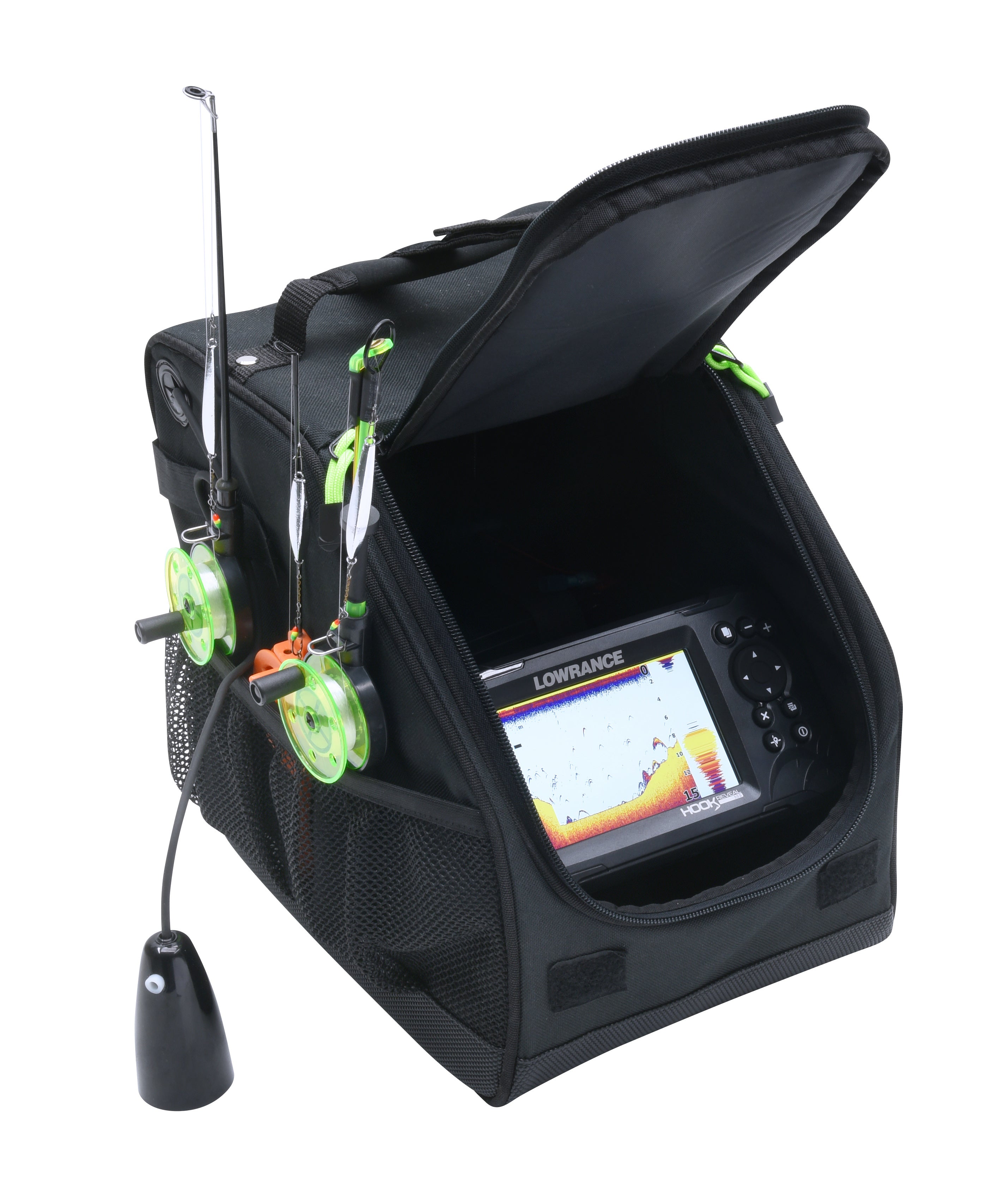 This Patriot sonar bag is perfect for 7-10" devices, fitting all brands and providing practical protection for your screen, transducer, battery, charger, and power cords. The bag has a sturdy strap, waterproof bottom, and adjustable cover to reduce reflections and protect against rain and snow. It also features website pockets for ice fishing gear and an adjustable sensor cable length.