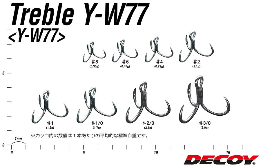 Decoy Y - W77 is a highly durable fishing hook (rated at SuperB level) with outstanding stability. One of the key advantages of Decoy hooks is their thinness, which allows for increased strength. The inwardly curved blades of the Y - W77 model provide excellent protection for lures against scratches and ensure effective hook retention. Additionally, Decoy Y - W77 is coated with a layer of Ni and tin, making it resistant to saltwater and other harsh environments. The hooks remain extremely sharp even after repeated contact with solid objects and can easily penetrate the hardest fish mouths.