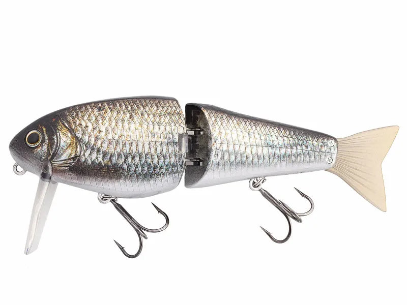 The two-part swimbait, NORIES Hira Crank 150F L-Bill, features a diving blade that runs just below the water's surface. The L-Bill diving blade produces a winding, rolling movement, giving the swimbait a natural swimming motion. When targeting active predators, it can easily be maneuvered faster for a powerful movement, while stronger tugs cause it to break out sideways. For attracting predatory fish from the bottom or obstacles, a slow movement is recommended. To avoid spooking large, trainable fish, the joints are made of full carbon and fitted with sound stoppers to prevent clanking metal noises. The movable tail fin supports the perfect S-shaped movement of this shallow water swimbait. NORIES Hira Crank 150F L-Bill is a top-quality swimbait suitable for catching black bass, pike, asp, and big perch.